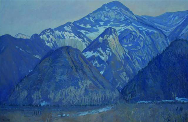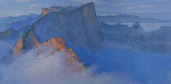 田學森離開繁華的大都市,懷著一顆敬畏自然,與天地精神交流的向往,感受華山的厚重,殉道般的投入創(chuàng)作。甘于寂寞,獨處華山十年,借鑒傳統(tǒng)山水畫意境,用油畫材料技法嘗試為千古華岳寫照。