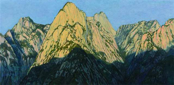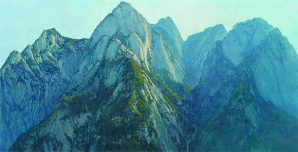 作品《神屏》,始于2013年春季寫生,東仰太華的清晨,主峰巍峨,山谷靜悄悄的,逆光下的高山統(tǒng)一在多層次的藍色調里,復雜的山石結構則需要反反復復耐心的修改塑造,畫長三米九,高兩米。