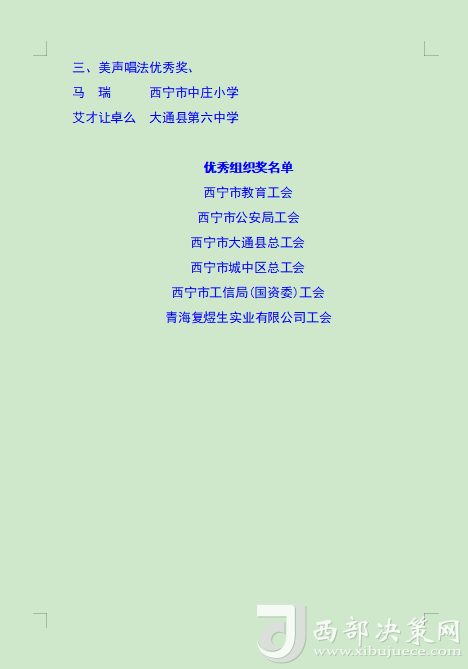 本次比賽旨在通過(guò)歌手們的激情演繹,增強(qiáng)全市廣大職工群眾的獲得感、幸福感、安全感,展現(xiàn)西寧市職工群眾的時(shí)代風(fēng)貌,進(jìn)一步營(yíng)造弘揚(yáng)勞模精神、勞動(dòng)精神、工匠精神的濃厚氛圍,為更高水平打造綠色發(fā)展樣板城市建設(shè)新時(shí)代幸福西寧增強(qiáng)信心、凝聚力量。(后附獲獎(jiǎng)名單)。