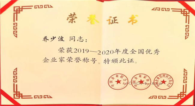 12月1日,以“弘揚(yáng)優(yōu)秀企業(yè)家精神,勇于創(chuàng)新?lián)?dāng)奉獻(xiàn)”為主題的“2020年全國企業(yè)家活動日暨中國企業(yè)家年會”在廣東省東莞市舉行。會上表彰了154名優(yōu)秀企業(yè)家,公司董事長、總經(jīng)理喬少波喜獲“2019-2020年全國優(yōu)秀企業(yè)家”稱號。