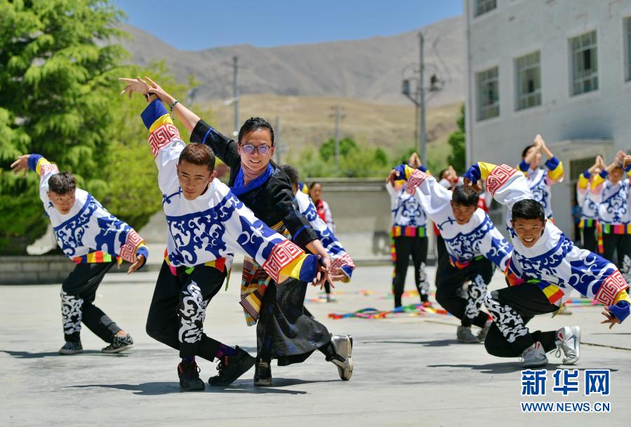 在西藏山南市第一高級(jí)中學(xué),來(lái)自湖北省武漢市旅游學(xué)校的援藏教師馬丹(左三)指導(dǎo)學(xué)生練習(xí)校園啦啦操(2019年5月8日攝)。新華社記者 張汝鋒 攝
