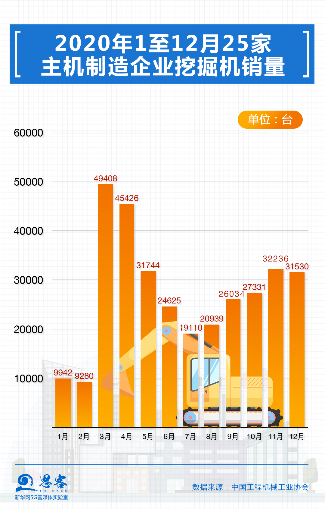 挖掘機(jī)銷(xiāo)量素有中國(guó)經(jīng)濟(jì)“溫度計(jì)”之稱(chēng)。據(jù)中國(guó)工程機(jī)械工業(yè)協(xié)會(huì)統(tǒng)計(jì),2020年12月納入統(tǒng)計(jì)的25家挖掘機(jī)制造企業(yè)共銷(xiāo)售各類(lèi)挖掘機(jī)31530臺(tái),同比增長(zhǎng)56.4%;全年共銷(xiāo)售挖掘機(jī)327605臺(tái),同比增長(zhǎng)39%。從百萬(wàn)億里程碑和挖掘機(jī)銷(xiāo)量增長(zhǎng)的背后,我們看到了怎樣的中國(guó)經(jīng)濟(jì)活力與圖景?