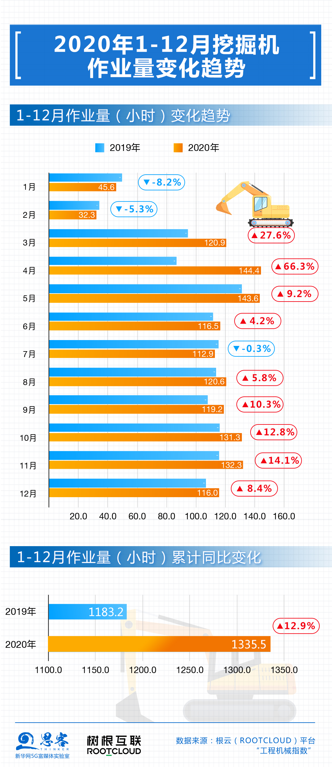 2020年,全年固定資產(chǎn)投資同比增長(zhǎng)2.9%。因?yàn)榕c基建工程關(guān)系緊密,挖掘機(jī)銷(xiāo)量和工作時(shí)長(zhǎng)往往被視為判斷基建行業(yè)發(fā)展情況的一個(gè)重要先行指標(biāo)。這一年里,修橋、鋪路,甚至5G基站、充電樁等新基建領(lǐng)域處處可見(jiàn)挖掘機(jī)的身影。