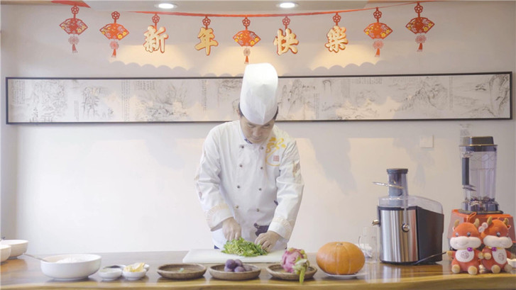 把切塊的蔬果依次放入榨汁機(jī)榨汁。