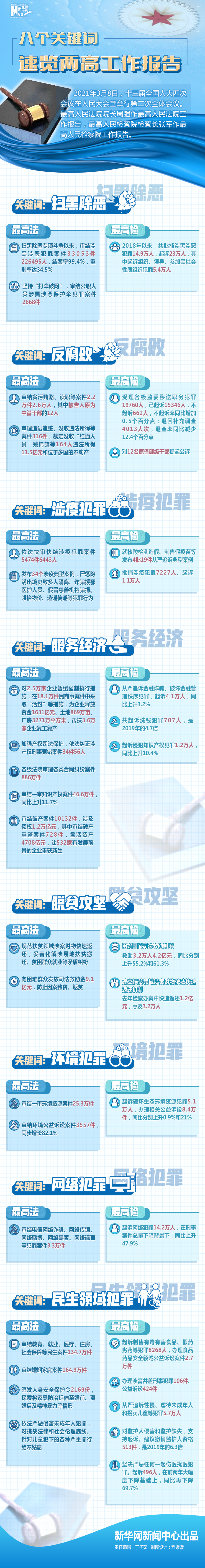 8日提請十三屆全國人大四次會議審議的兩高報告,交出一份滿滿的成績單。掃黑除惡“打傘破網(wǎng)”、嚴(yán)懲腐敗守護(hù)平安、加強(qiáng)民生司法保障……一串串?dāng)?shù)字勾勒出法治中國建設(shè)的亮點(diǎn)。