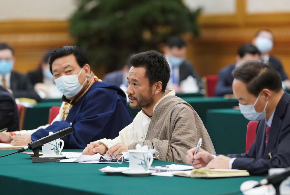 ↑ 3月7日,在參加十三屆全國(guó)人大四次會(huì)議青海代表團(tuán)審議時(shí),扎西多杰就玉樹災(zāi)后重建新變化發(fā)言。新華社記者李學(xué)仁攝