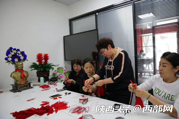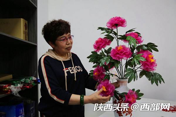 延安市寶塔區(qū)電商直播融合孵化服務(wù)中心,60歲的退休大媽董智玲在教大家做絲網(wǎng)花,她們做著山丹丹花,唱著《山丹丹花開(kāi)紅艷艷》,到這里來(lái)學(xué)手工花的制作成了一件快樂(lè)的事。