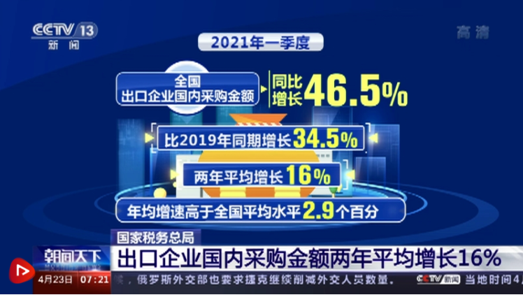 從稅收看經(jīng)濟(jì)|一季度全國(guó)出口企業(yè)國(guó)內(nèi)采購(gòu)金額同比增長(zhǎng)46.5%