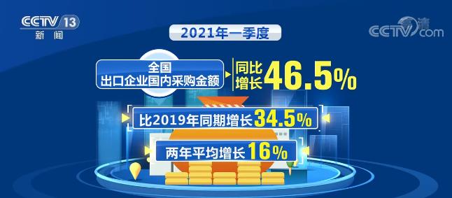 2021年一季度,海外需求復(fù)蘇繼續(xù)拉動(dòng)我國(guó)出口快速增長(zhǎng),全國(guó)出口企業(yè)國(guó)內(nèi)采購(gòu)金額同比增長(zhǎng)46.5%,比2019年同期增長(zhǎng)34.5%,兩年平均增長(zhǎng)16%,年均增速高于全國(guó)平均水平2.9個(gè)百分點(diǎn)。