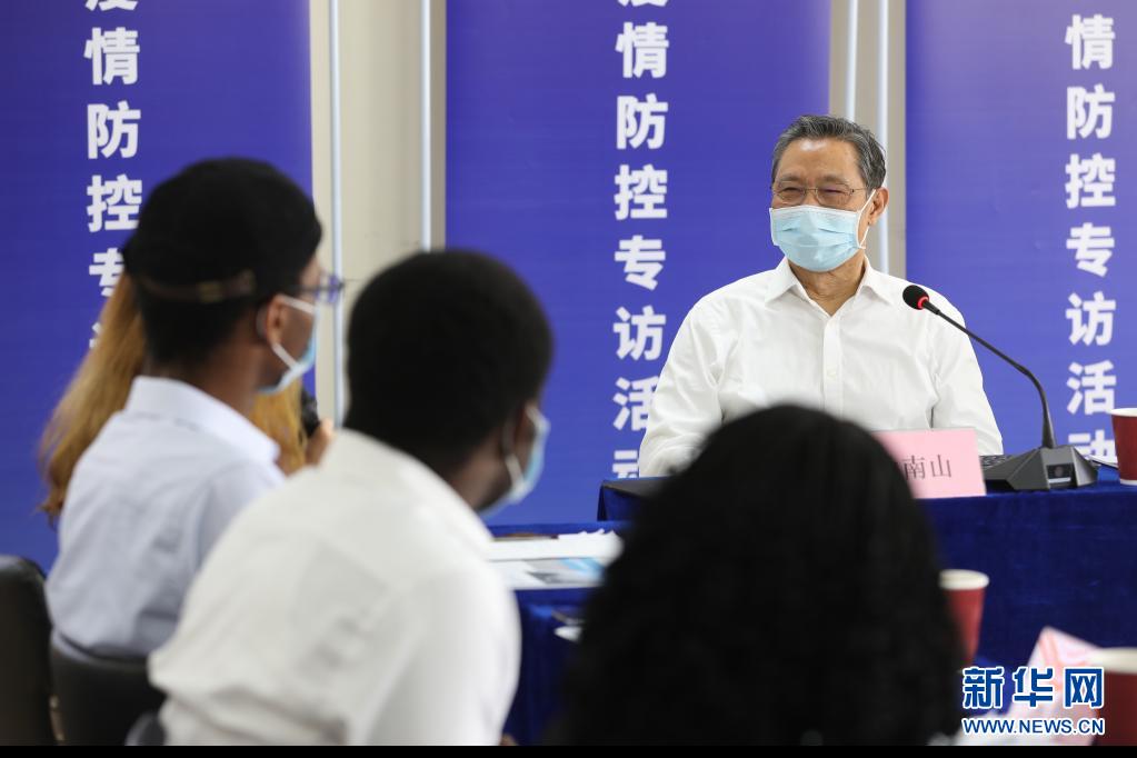 2020年4月15日,廣州市人民政府新聞辦公室在廣州醫(yī)科大學(xué)舉辦廣州市第78場疫情防控新聞采訪活動,鐘南山與在穗工作學(xué)習(xí)的外籍人士代表進(jìn)行座談交流。新華社記者 李嘉樂 攝