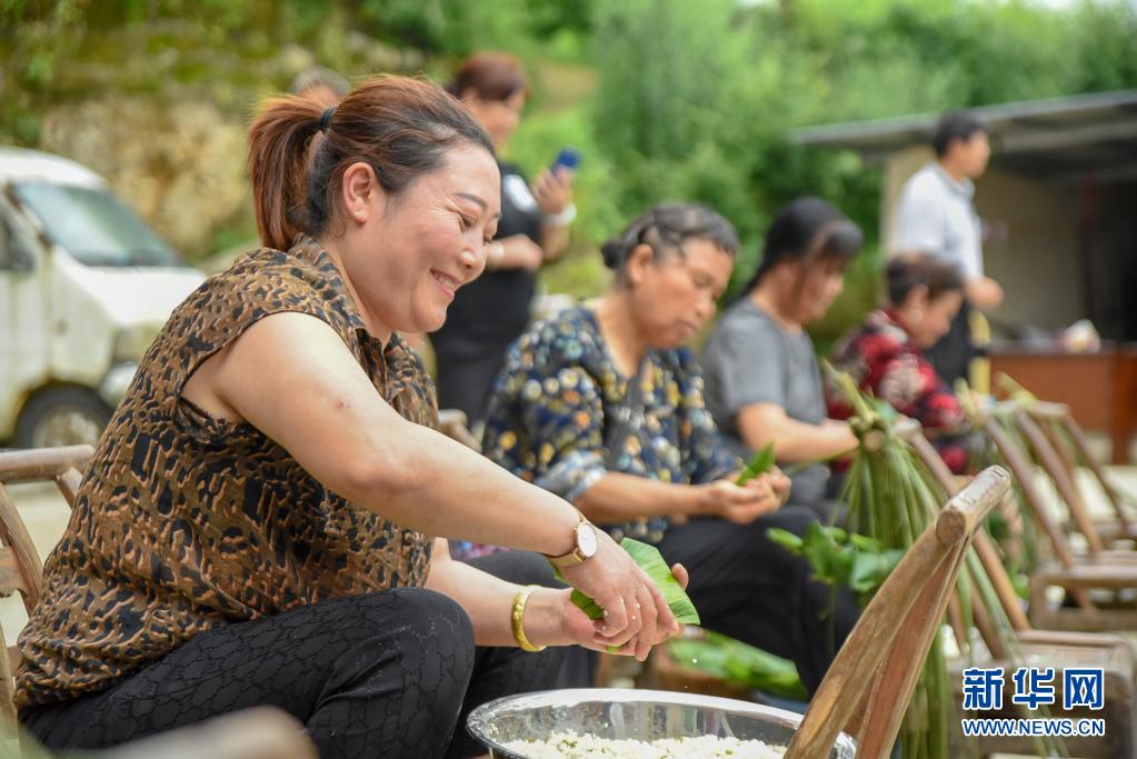 端午節(jié)將至,貴州省銅仁市玉屏侗族自治縣亞魚鄉(xiāng)郭家灣村舉行“我們的節(jié)日,端午”群眾文化活動,村民們聚在一起比賽包粽子,喜迎端午節(jié)。
