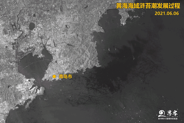 ▲圖為SAR衛(wèi)星拍攝的黃海海域時序動態(tài)圖,可以清晰地看到滸苔潮發(fā)展的過程。