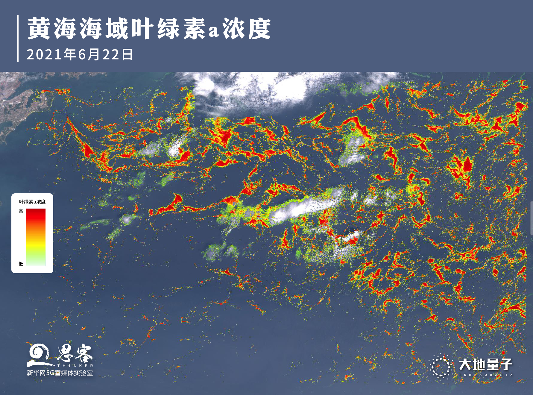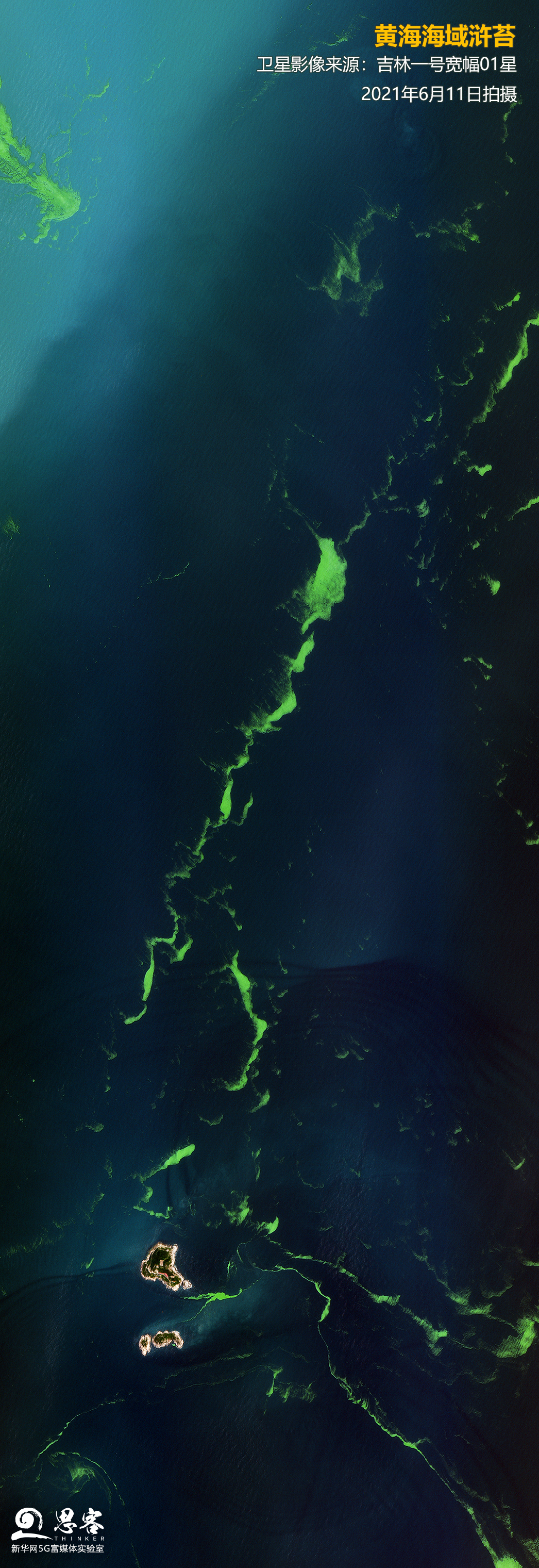 ▲圖為吉林一號寬幅01星2021年6月11日拍攝的黃海海域滸苔。