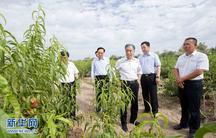 7月21日至24日,中共中央政治局常委、全國政協(xié)主席汪洋在新疆調(diào)研兵團工作。這是23日,汪洋在兵團十師北屯市千畝桃園了解果樹長勢。新華社記者 李濤 攝