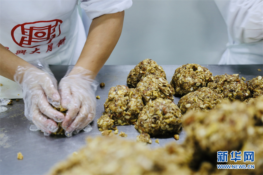 工人將月餅餡料稱重后揉捏成團(tuán)。鐘涓涓 攝