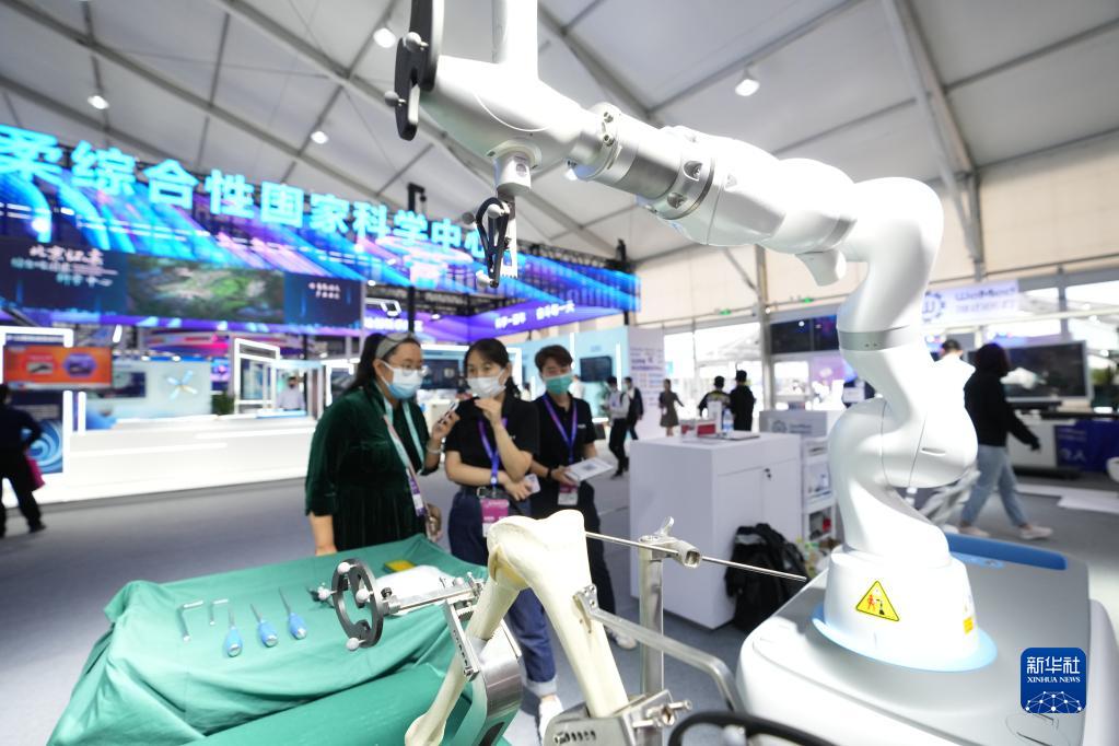 參觀者在2021中關(guān)村論壇展覽(科博會)參觀展出的一款適用于全膝關(guān)節(jié)置換手術(shù)的機(jī)器人。(9月25日攝)。新華社記者 鞠煥宗 攝