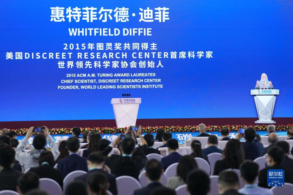 2015年圖靈獎共同得主惠特菲爾德·迪菲在2021中關(guān)村論壇全體會議上視頻致辭(9月25日攝)。新華社記者 鞠煥宗 攝