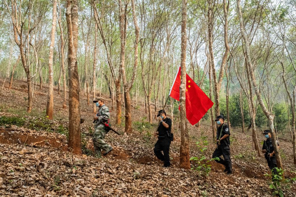日前,記者跟隨段二文等人,走了一段他認(rèn)為很普通的巡邊路。當(dāng)天,熟悉路況的段二文走在最前面,遇到不好通過的地方,他拿著砍刀幾下就清除了障礙。隨后穿越一片橡膠林,經(jīng)過一條用來區(qū)分國境線的石板路,抵達最終的目的地——S144-2號界樁。