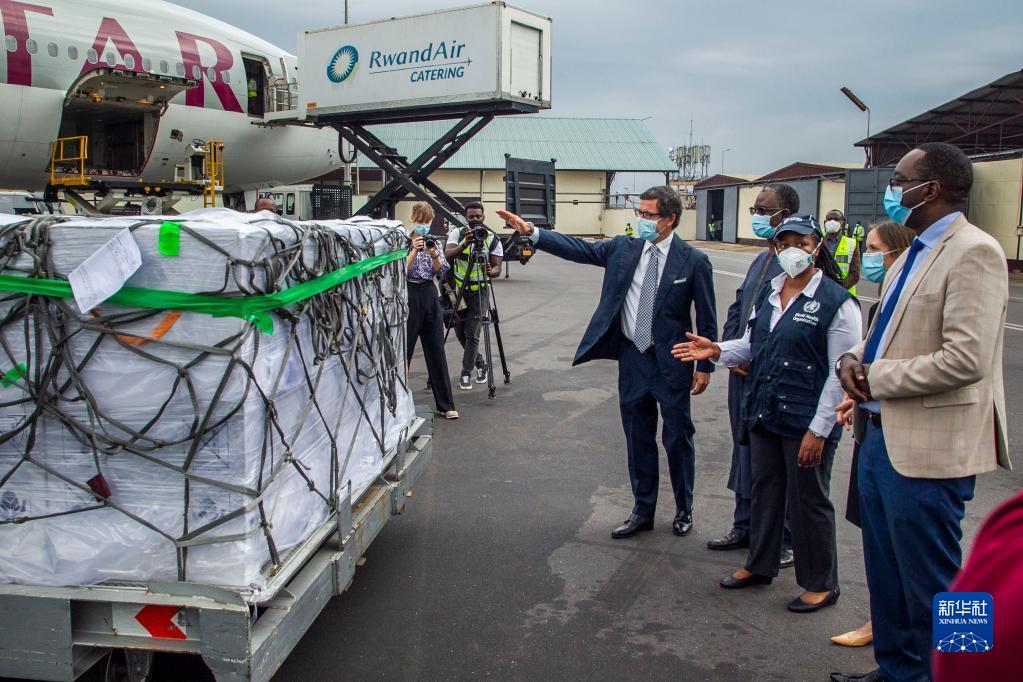盧旺達(dá)衛(wèi)生部長(zhǎng)達(dá)尼埃爾·恩加米杰(右一)等官員在基加利國(guó)際機(jī)場(chǎng)查看該國(guó)首批通過(guò)COVAX計(jì)劃收到的新冠疫苗(2021年3月3日)。新華社發(fā)(西里爾·恩德格亞攝)