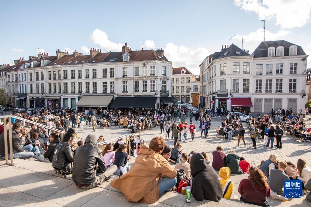 人們?cè)诜▏?guó)里爾市中心休閑(2021年5月19日攝)。新華社發(fā)(塞巴斯蒂安·庫(kù)爾吉攝)