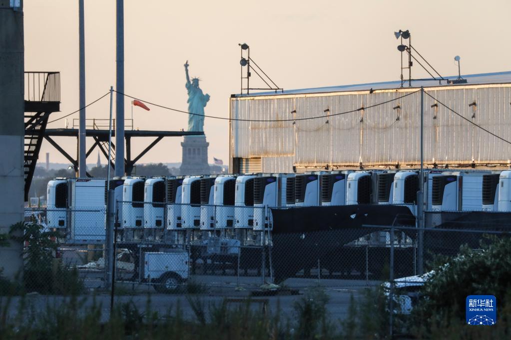 這是在美國(guó)紐約布魯克林拍攝的一處臨時(shí)停尸場(chǎng)內(nèi)存放新冠患者遺體的冷藏車(2021年9月6日攝)。新華社記者 王迎 攝
