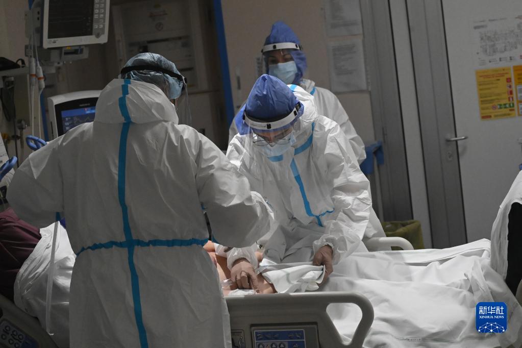 醫(yī)務(wù)人員在意大利博洛尼亞一家醫(yī)院的新冠隔離區(qū)對(duì)患者進(jìn)行治療(2021年12月3日)。新華社發(fā)(賈尼·斯基基攝)