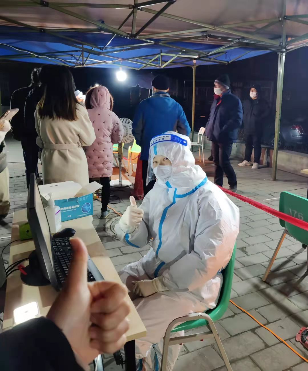 認(rèn)真聽取社區(qū)干部講解和演示三遍,反復(fù)問了十余個問題,四位女孩子沉著的與三名采集拭子醫(yī)護人員擺開陣勢、拉開小區(qū)新一輪核酸采集的前線。