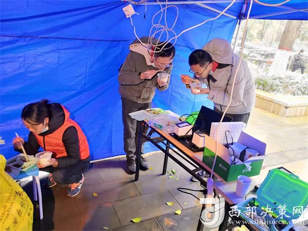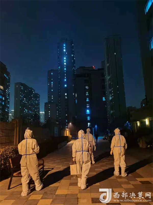 正當隊員們準備修整一天時,新的命令到了,要求醫(yī)療隊安排300名隊員支援雁塔區(qū)核酸采集工作,大家毫無怨言,坐上了趕赴雁塔區(qū)的大巴。這是最不尋常的一天,醫(yī)療隊承擔了雁塔區(qū)近10個居民區(qū)的核酸采樣任務,且大部分都屬于封控區(qū)。核算采樣需上門采集,風險大、難度高,因為信息采集設備無法上樓,只能依靠人工信息錄入,隊員們身穿防護服,在操作極其困難的情況下做到了不漏一戶,不落一人。采集結束已是25日凌晨1點,來自漢臺區(qū)的余晗和趙凌最后的采集任務已是凌晨2點,此時的千年古都正飄落著冬日的雪花。這次入戶采集共完成49081人次。