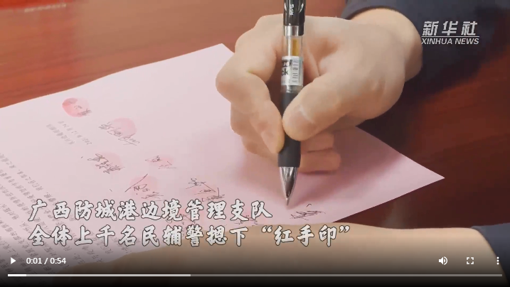 廣西防城港邊境管理支隊(duì)上千名民輔警集體遞交“戰(zhàn)疫請(qǐng)戰(zhàn)書”,主動(dòng)要求向抗疫最前線靠攏。他們繼續(xù)選擇逆行,奔赴國(guó)門口岸、邊境卡口、村寨社區(qū),始終奮戰(zhàn)在最前線,維護(hù)檢測(cè)現(xiàn)場(chǎng)秩序,保障救援力量通行,強(qiáng)化邊境巡邏防控。“請(qǐng)戰(zhàn)書”上的一個(gè)個(gè)“紅手印”,見證忠誠(chéng)。