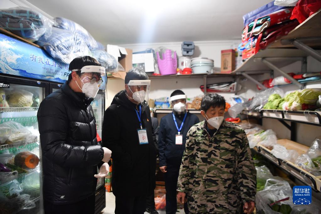 12月27日,在西安市雁塔區(qū)孟村小區(qū),盧晨陽(左一)與社區(qū)工作人員查看商鋪物資儲(chǔ)備情況。新華社記者 張博文 攝