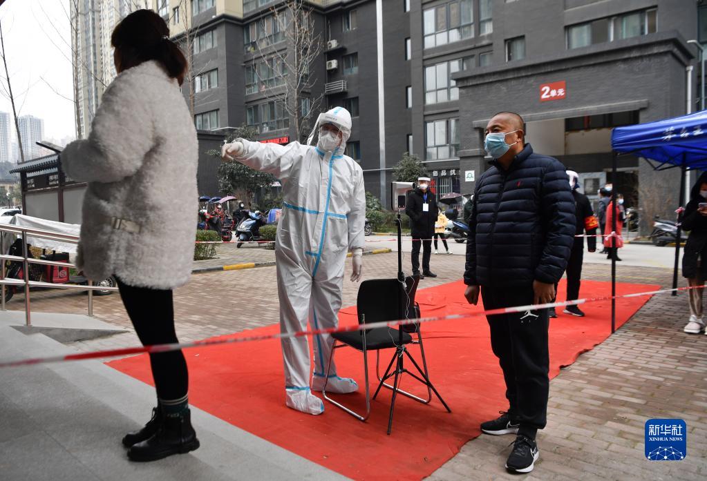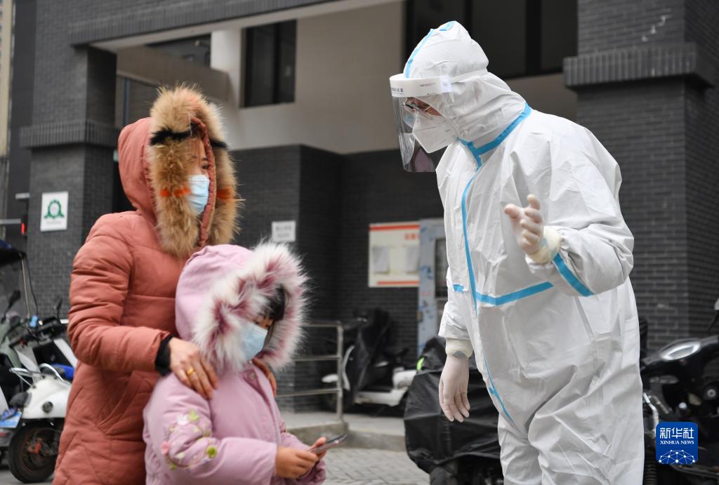 12月27日,在西安市雁塔區(qū)孟村小區(qū),盧晨陽(左二)引導(dǎo)居民進(jìn)行核酸檢測(cè)。新華社記者 張博文 攝