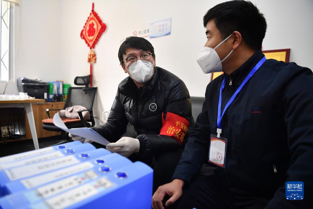 12月27日,在西安市雁塔區(qū)孟村小區(qū),盧晨陽(左)在查閱孟村小區(qū)疫情防控臺(tái)賬。新華社記者 張博文 攝