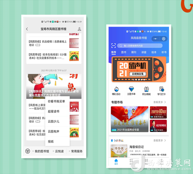閉館不閉網(wǎng),線上服務不打烊。自12月23日閉館以來,區(qū)圖書館整合各類數(shù)字資源,免費提供豐富的線上服務,滿足不同年齡群體讀者的閱讀需求,更新“超星閱讀”APP,電子書、數(shù)字期刊、講座、繪本、聽書等海量資源為讀者提供高質(zhì)量的閱讀福利。利用“陜西數(shù)字文化網(wǎng)”“鳳翔區(qū)圖書館官方網(wǎng)站”“鳳翔區(qū)圖書館”公眾微信號,線上開設【鳳圖戰(zhàn)疫】【鳳圖薦讀】【紅色故事繪】【館員姐姐講故事】【館員有聲薦讀】【鳳圖文苑】等閱讀服務專欄,提供疫情防控知識、繪本閱讀、親子故事講讀、線上展覽等,讀者通過關(guān)注“寶雞市鳳翔區(qū)圖書館”公眾號、網(wǎng)站享受24小時線上服務,通過鳳翔區(qū)圖書館總分館群,將這些優(yōu)質(zhì)數(shù)字資源向基層分館輸送,讓廣大讀者暢享“云端閱讀”。