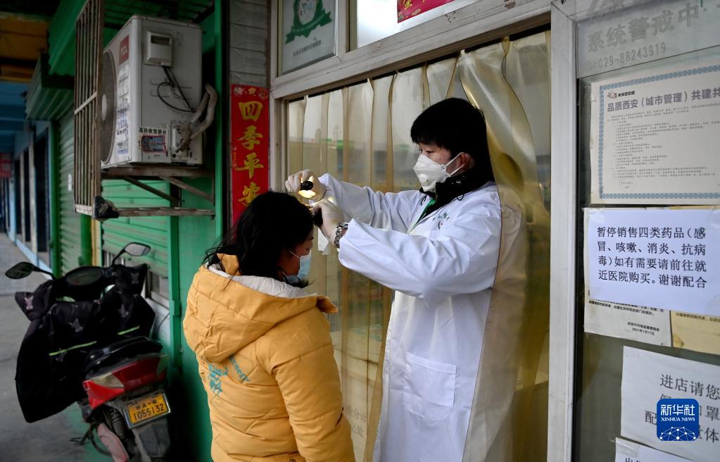 1月7日,西安市未央?yún)^(qū)西唐寨村一家藥店的負(fù)責(zé)人韓春陽在為村民看診。疫情發(fā)生后,藥店一直沒有關(guān)門,韓春陽每天會(huì)接到六七個(gè)線上線下的咨詢,下班后還會(huì)給鄰近村子的村民送藥。