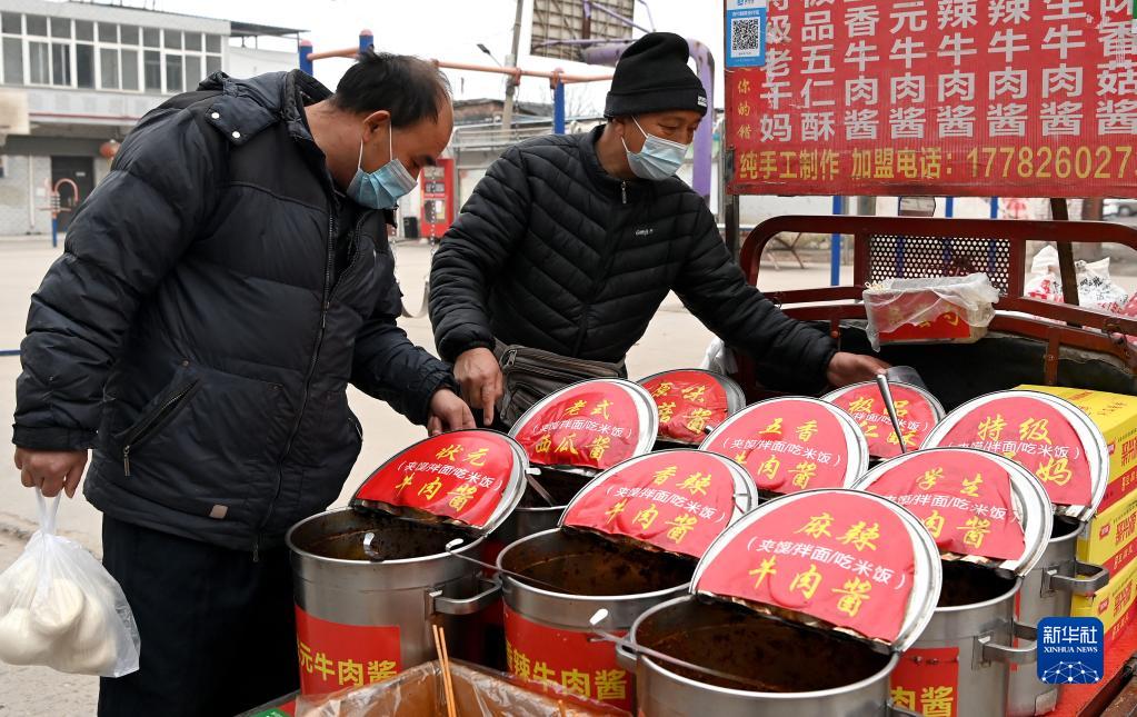 1月7日,西安市未央?yún)^(qū)西唐寨村村民在購買食品。