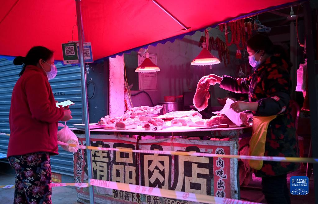 1月7日,西安市未央?yún)^(qū)西唐寨村村民在村里的肉店買肉。