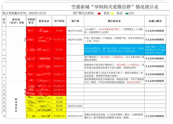 “人命關(guān)天,要趕緊把孕婦的底數(shù)摸清,她們住哪里、電話多少,同時(shí)也要想辦法把現(xiàn)有的醫(yī)生和孕婦‘連起來’,把專業(yè)的事情交給專業(yè)的人來解決。”據(jù)空港新城黨委組織部部長(zhǎng)葛峰介紹,2021年12月31日早上,在了解到陽(yáng)光里社區(qū)有孕婦需要去醫(yī)院進(jìn)行檢查和分娩的需求后,當(dāng)天下午4點(diǎn)多,社區(qū)黨支部書記殷振建就迅速將22名孕婦的相關(guān)情況及時(shí)上報(bào)給組織部,并由專人對(duì)群里孕媽媽們的訴求進(jìn)行實(shí)時(shí)統(tǒng)計(jì)。
