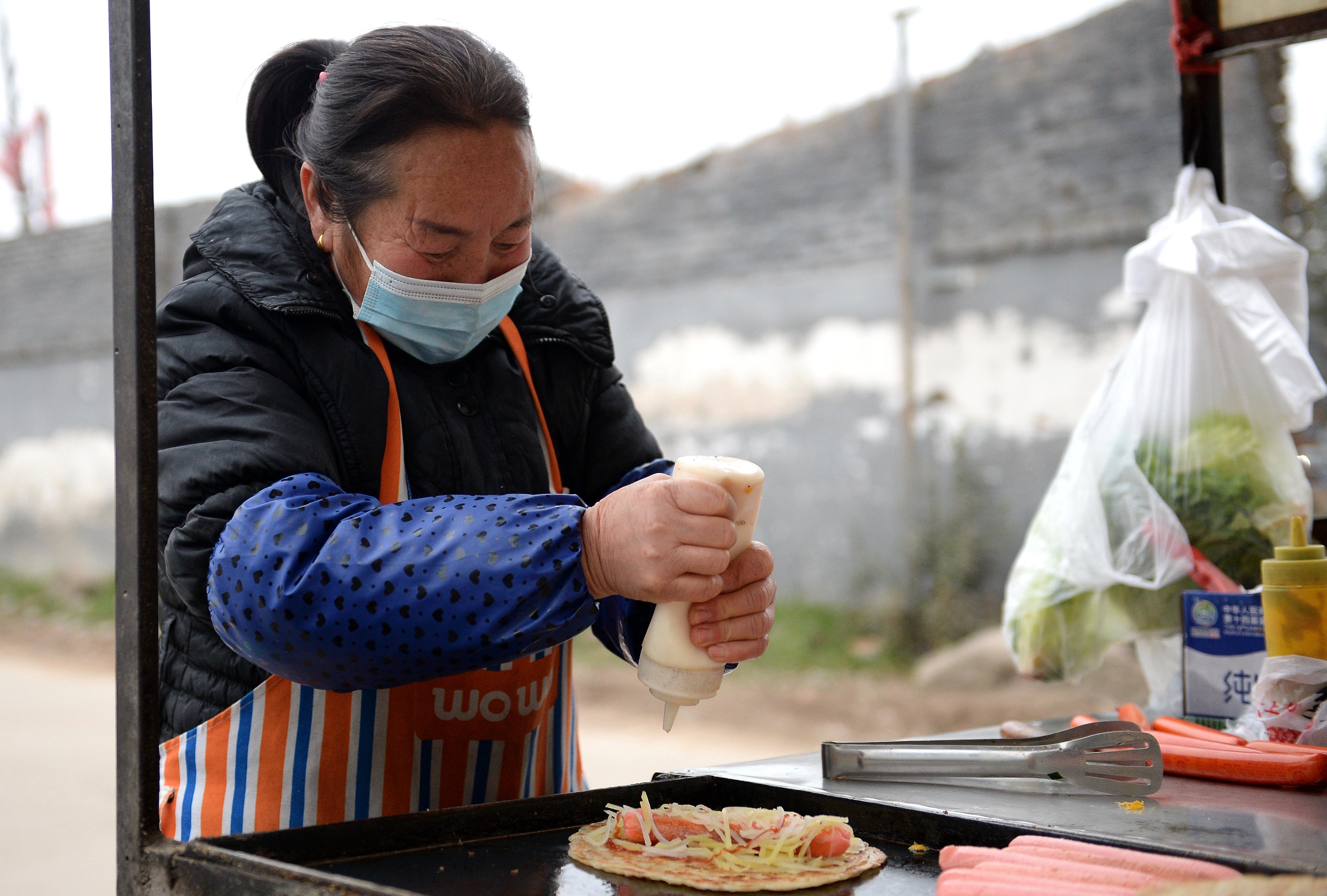 “多一點(diǎn)沙拉醬!”“好嘞!”攤餅、切烤腸、加土豆絲、摘青菜、擠沙拉醬……趙軍曉動(dòng)作嫻熟,不到三分鐘,就把一份新鮮的手抓餅遞給了攤前的顧客。作為西唐寨村的村民,這是西安多日封閉式管理以來,她第一天外出擺攤。“有點(diǎn)興奮,通知五點(diǎn)可以出來,我四點(diǎn)就把東西準(zhǔn)備好了!”雖然戴著口罩,她仍是笑意難掩。