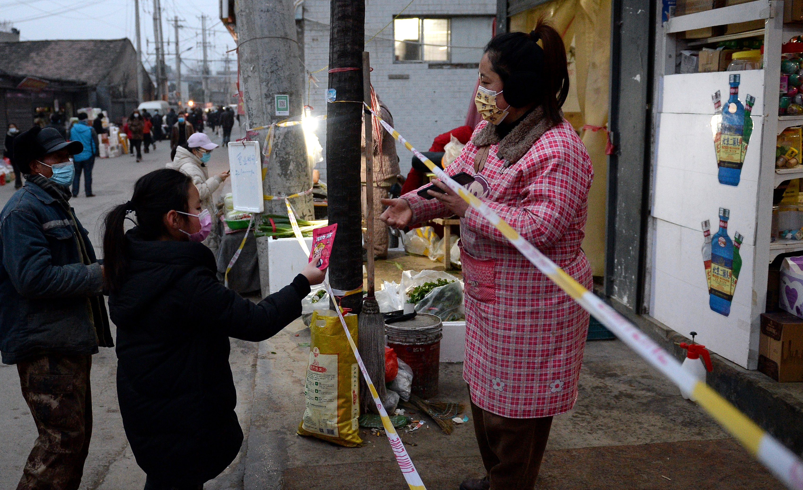 在趙軍曉的對(duì)面是一家饅頭店,三列銀白色的不銹鋼蒸籠堆得比人高,不時(shí)“噗噗”地冒著熱氣。上層的饅頭色白、圓潤(rùn)而飽滿,不斷被店主一齊摟進(jìn)袋子,遞給警戒線外的排隊(duì)購買的三五村民。“他們家的饅頭好吃!”村民薛東紅剛采購了兩個(gè)白蘿卜、三顆大白菜,打算再買幾袋饅頭就回家,“我家還有十多個(gè)房客,多買點(diǎn)也能給大家分一分。”她說。