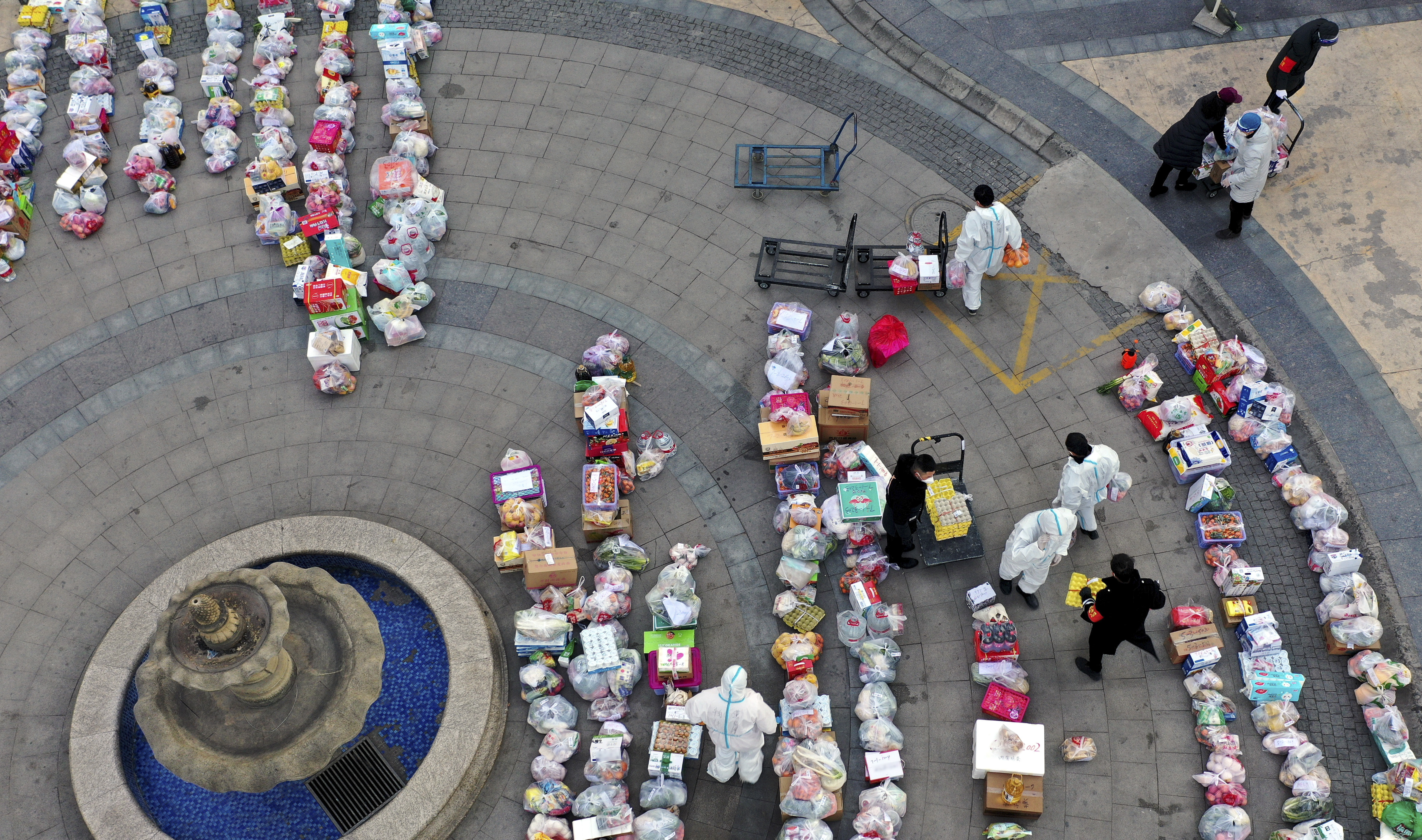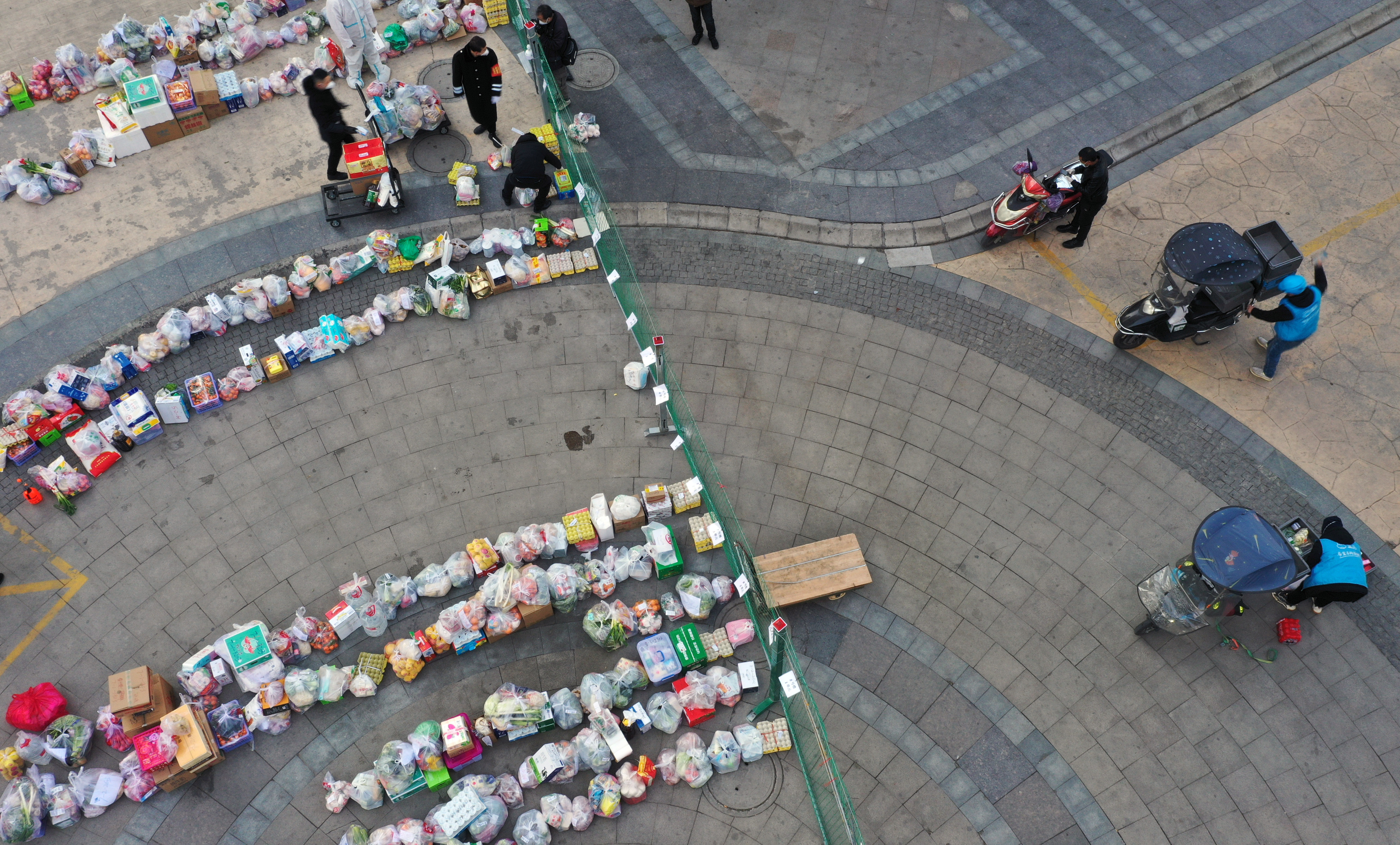 1月12日,下沉干部和志愿者在社區(qū)門前小廣場接收居民線上購買的生活物資(無人機(jī)照片)。