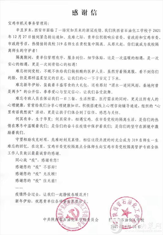 西部決策網(wǎng)訊 (任書彥)12月27日晚9時,寶雞市機(jī)關(guān)事務(wù)管理局接到緊急命令:來自陜西省石油化工學(xué)校319名學(xué)生將于28日早6時到達(dá)寶雞市委黨校開始集中隔離,寶雞市機(jī)關(guān)事務(wù)管理局負(fù)責(zé)此次隔離學(xué)生的后勤保障工作。這是寶雞市機(jī)關(guān)事務(wù)管理局自全國十四運(yùn)會、第八屆特奧會之后,又迎來的一次“大考”。