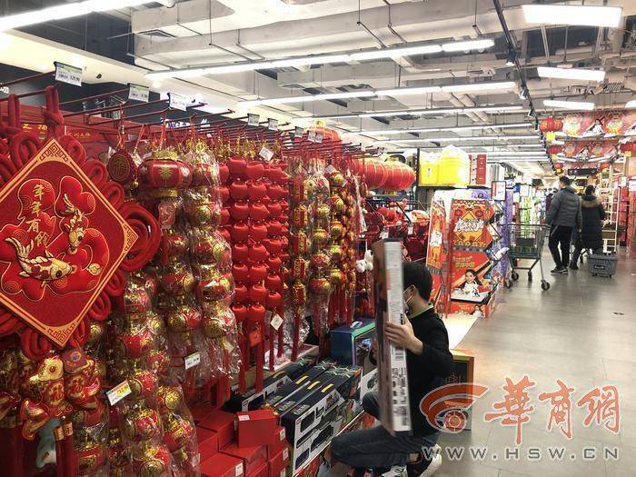 記者體驗(yàn)了一下,超市嚴(yán)格落實(shí)防疫要求,顧客掃碼,憑綠碼進(jìn)入。超市門口,有燈籠、“福”字等年貨。超市播著過(guò)年喜慶的音樂(lè),貨物齊全,市民們?cè)谟行蛸?gòu)物,工作人員正在給部分貨物加貨。