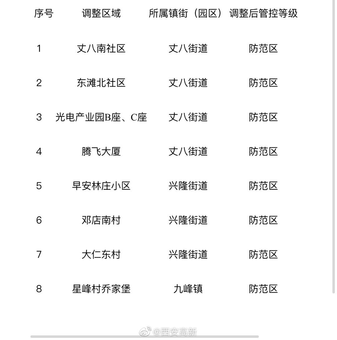 按照國(guó)務(wù)院聯(lián)防聯(lián)控機(jī)制和省、市關(guān)于新冠肺炎疫情社區(qū)防控工作要求,結(jié)合西安高新區(qū)疫情防控形勢(shì),經(jīng)高新區(qū)新冠肺炎疫情防控指揮部研判,報(bào)市疫情防控指揮部備案同意,決定自2022年1月23日起,對(duì)部分區(qū)域進(jìn)行調(diào)整管理,具體如下:將丈八街道丈八南社區(qū)等3個(gè)鎮(zhèn)街的8個(gè)小區(qū)村、樓棟調(diào)整為防范區(qū)(具體名單見(jiàn)下表)。