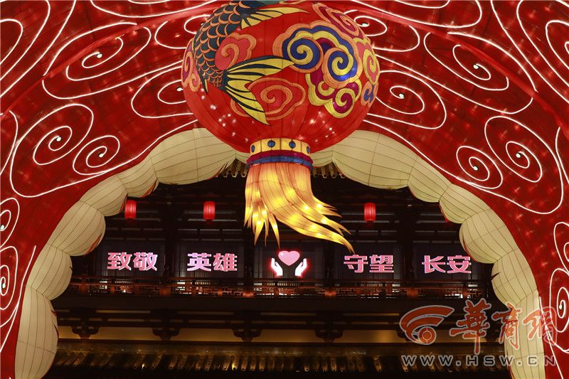 在雁南一路口設(shè)置了“致敬英雄 守望長(zhǎng)安”燈組。宋立嬌介紹,設(shè)計(jì)這組燈是為了向抗疫英雄致敬,并鼓舞全市人民抗疫士氣。雁南一路以南水池上“百鳥(niǎo)朝鳳”燈組,以鳳凰、牡丹、百鳥(niǎo)為主題,打造百鳥(niǎo)朝鳳氛圍裝置,體現(xiàn)出一切生機(jī)勃勃,美好時(shí)光來(lái)臨,看到了一片美好的前景。