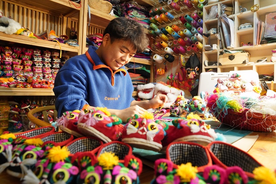 “打袼褙(ge bei)、剪鞋樣、包邊、納底、做鞋幫、繡虎臉、縫合、成型,即使是最簡(jiǎn)單的虎頭鞋,制作一雙都得需要一周時(shí)間。”夏璐璐介紹,關(guān)中刺繡的針法主要有“扎”和“掛”兩種,從刺繡的圖案和造型看,它們都帶有古老的文化元素,諸如小孩用的虎頭帽、虎頭鞋和老虎枕等,每一件作品都是將美好的故事通過(guò)刺繡布藝的方式展現(xiàn)出來(lái),反映了人們對(duì)美好生活的向往。