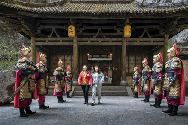 “女王駕到”“恭迎女王陛下”“諸位請(qǐng)起,游玩到此,觀景甚美,諸位與我,共享此景。”在天生三橋景區(qū)天福官驛客棧,一群身形魁梧的帶刀侍衛(wèi),整齊的站在驛站門(mén)口兩側(cè)恭迎每位入園的“女王”?,F(xiàn)場(chǎng)儀式感爆棚,一身金黃的“女王”霸氣外露。驛站內(nèi)熱鬧的氛圍吸引了眾多游客參與,有的上前與侍衛(wèi)互動(dòng)拍照,有的主動(dòng)穿上“女王”服體驗(yàn)霸氣女王范,有的還主動(dòng)表演起了電影里女王翻牌的有趣橋段。“今天我最大,這樣過(guò)節(jié)著實(shí)過(guò)癮”玩得正起勁的劉女士表示,這是她過(guò)得最好玩、最具儀式感的女王節(jié)。