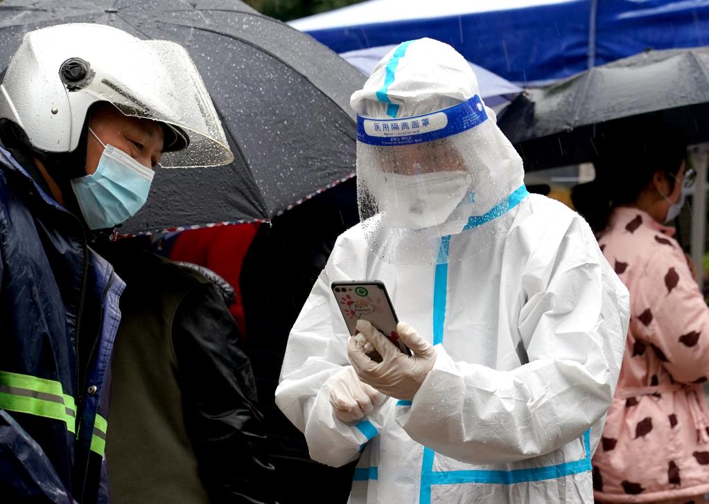 3月13日,志愿者在深圳羅湖區(qū)東門廣場核酸檢測點引導居民。新華社發(fā)(儲焱攝)