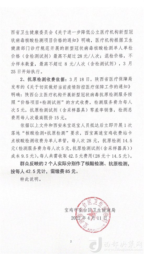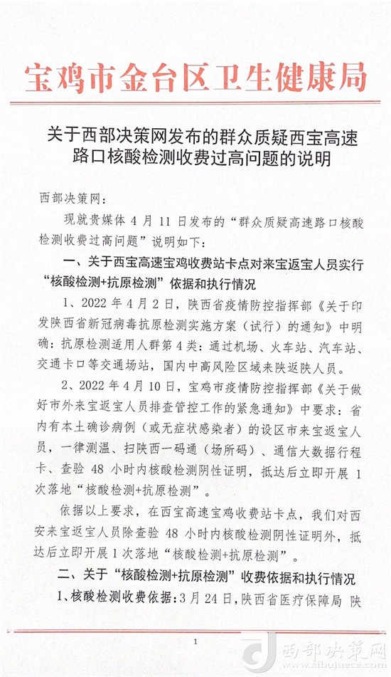 熱線回復|4月11日,寶雞市金臺區(qū)衛(wèi)生健康局就“群眾質疑高速路口核酸檢測收費過高問題”向西部決策網(wǎng)回復并進行了情況說明。具體內容如下: