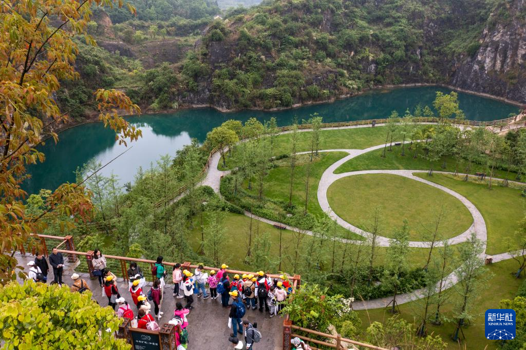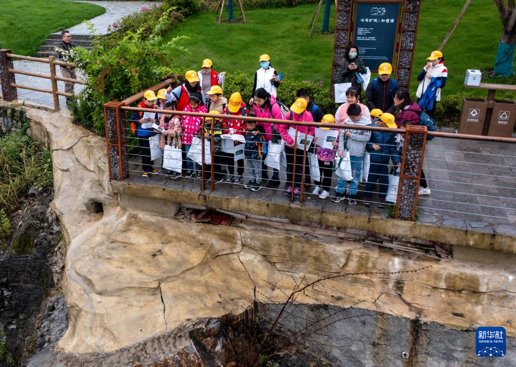 4月17日,參加活動(dòng)的中小學(xué)生在地質(zhì)專(zhuān)業(yè)工作人員的帶領(lǐng)下,對(duì)銅鑼山礦山公園的地質(zhì)遺跡和生態(tài)修復(fù)進(jìn)行科學(xué)考察(無(wú)人機(jī)照片)。