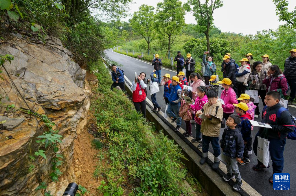 4月17日,參加活動(dòng)的地學(xué)旅游愛(ài)好者、中小學(xué)生和部分媒體工作者,在地質(zhì)專(zhuān)業(yè)工作人員的帶領(lǐng)下進(jìn)行銅鑼山科學(xué)考察。